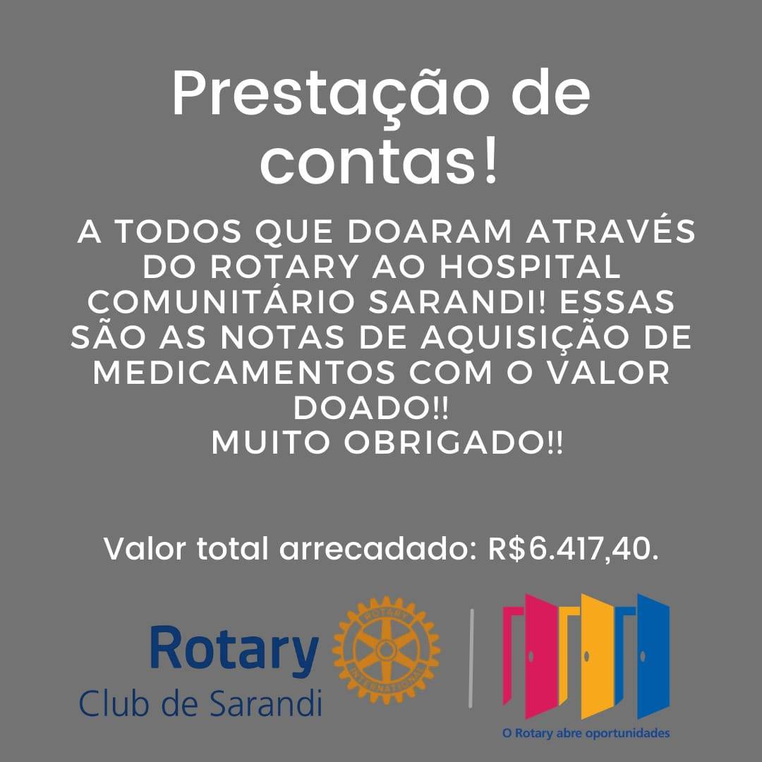 Passando para agradecer a todos que contribuíram para as doações do @hospitalcomunitariosarandi, com a doação arrecadamos o valor de R$6.417,40, sendo que R$2.300,00 deste valor veio do fundo de reserva do Distrito 4700, e o restante de doações das pessoas que colaboraram com a ação, com o valor foram adquiridos alguns tipos de medicamentos necessários para uso hospitalar, o Rotary Club de Sarandi, agradece a colaboração de todos os envolvidos!!! Cuidem-se e cuidem dos outros!!!