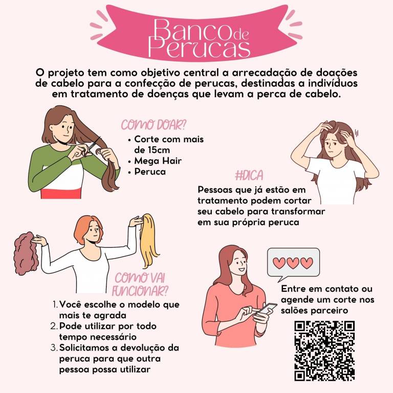 O propósito do "Banco de Perucas" é criar um espaço onde uma variedade de estilos de perucas estará disponível, permitindo que as pessoas escolham aquela que mais lhes agrada e se sintam confortáveis. O objetivo é elevar a autoestima e proporcionar uma experiência positiva durante o processo de tratamento. Importante ressaltar que todo esse processo é oferecido de forma gratuita pelo projeto.